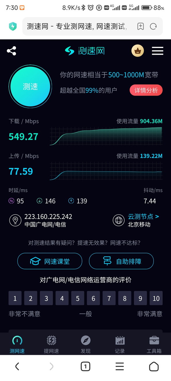 在合适的信号下广电5G还是挺强的,大概是限了500Mbps,测一次速刷去1G的流量。