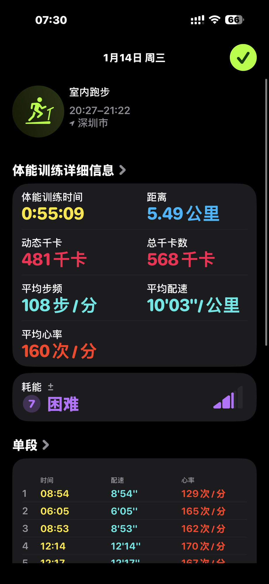 后面接着又补了一公里,想着稍微快点但试了下心率还是不允许,于是依旧7km/h的速度说是跑实则走的划过了这一公里。这样今天总计运动5.5公里,恢复计划继续。